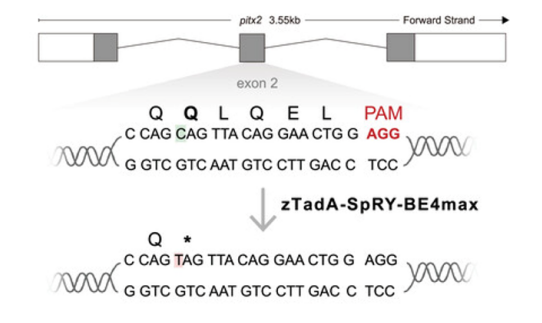 使用宽松编辑基序限制且高效的碱基编辑器zTad-SpRY-BE4max进行靶向编辑后(Zheng S, et al., 2025),成功在斑马鱼中构建了精准模拟人类PITX2 Q50*的pitx2 Q48*模型,pitx2 Q48*纯合子F1突变体在5 dpf时表现出前房发育不足和颅面畸形,反映了人类ARS病例中的表型特征。